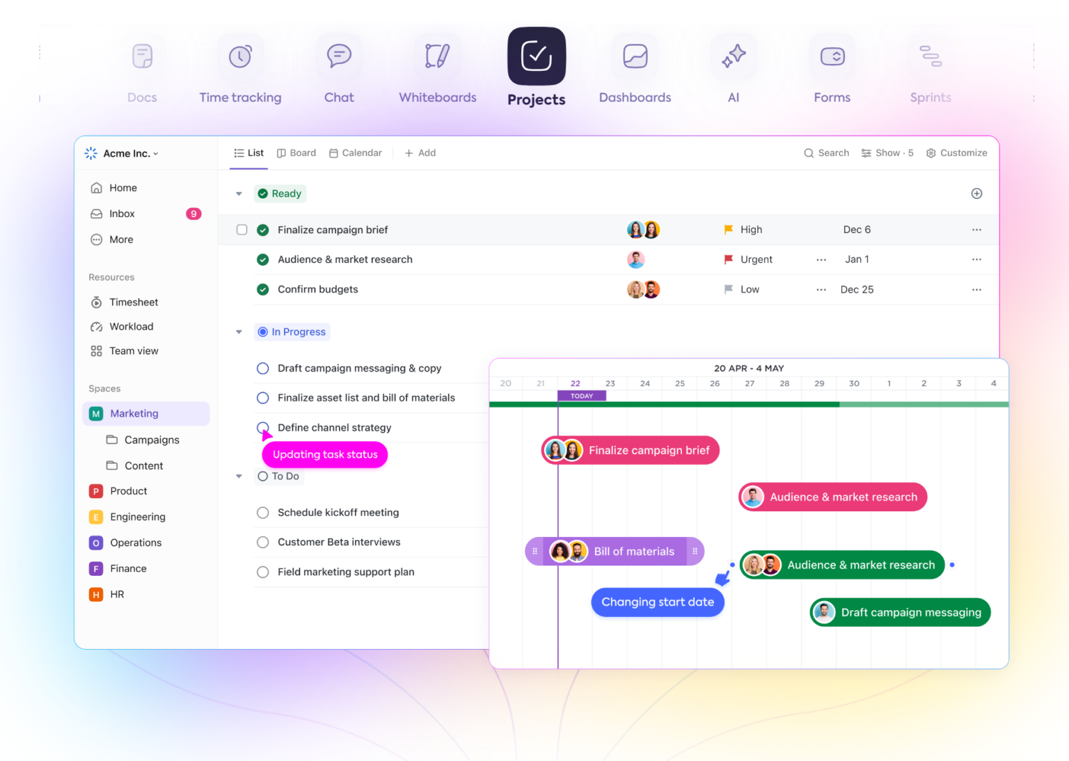 ClickUp은 리스트, 보드, 간트차트, 캘린더, 마인드맵 등 10가지 이상의 시각화 뷰를 제공합니다.