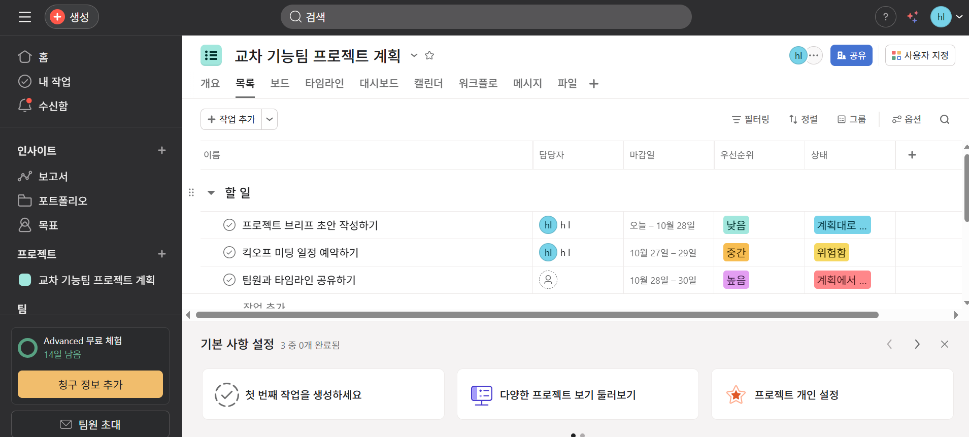 ClickUp은 자유도가 높지만 초기 설정이 복잡하고,  Asana는 기능은 제한적이지만 즉시 사용 가능한 장점도 있죠.
